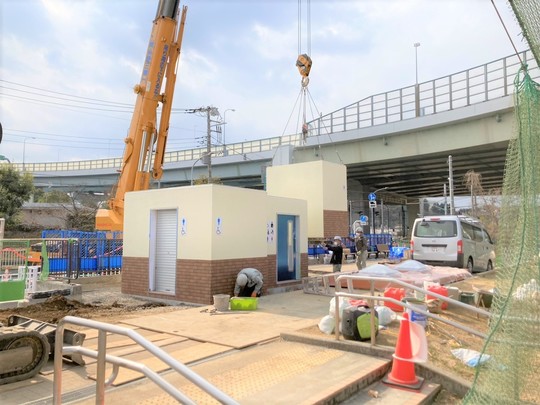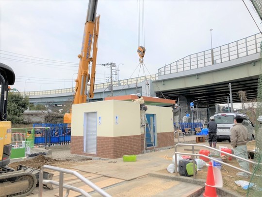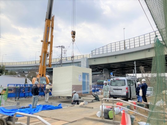 工場で作製した多目的トイレを大型クレーンで釣り上げ、ベースの位置に配置します。