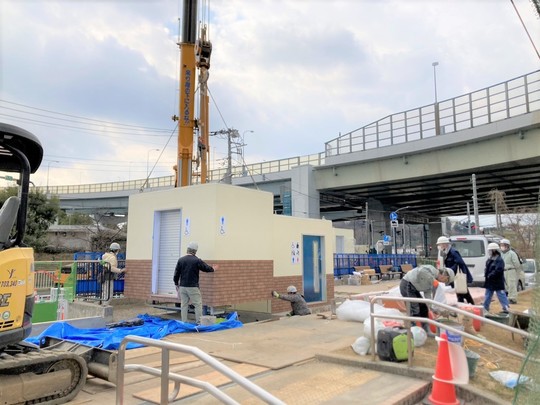 既に設置した多目的トイレを傷つけないよう、念入りに確認しながら設置しています。